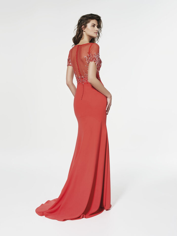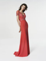 Abito rosso corallo st patrick con corpetto trasparente sulle spalle decorato da cristalli gonna morbida con coda