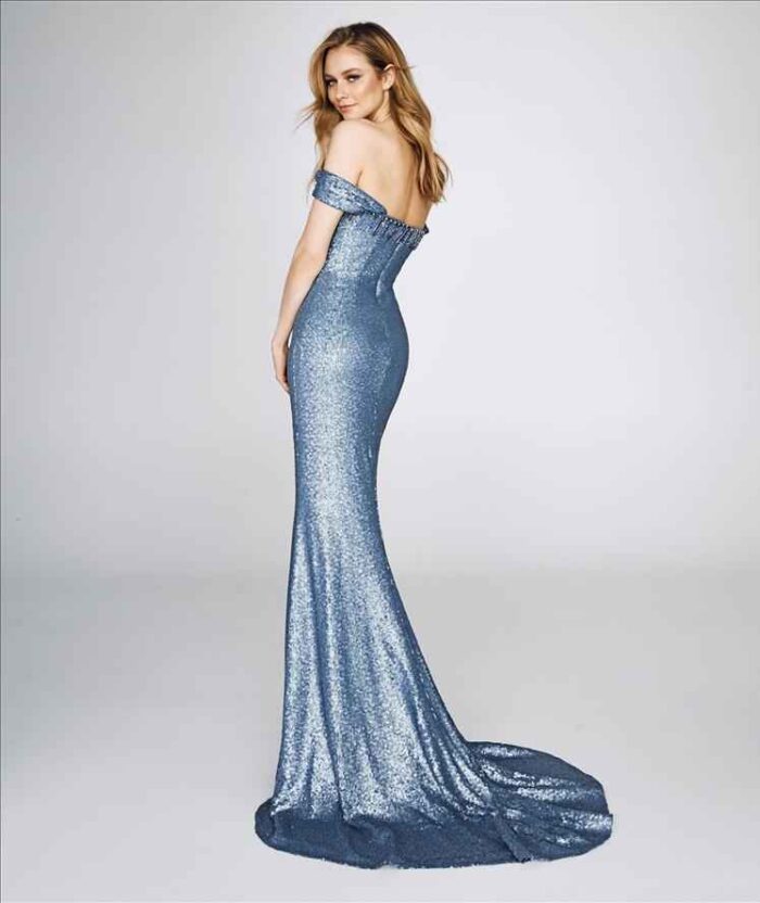 Abito st patrick in paillette blu chiaro modello a sirena con coda spalle scoperte con piccola manica