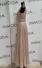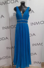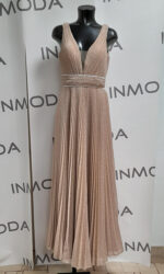 Abito tessuto brillantinato e plissettato in due colori rosa e azzurro con trasparenza sullo scollo e cristalli decorativi