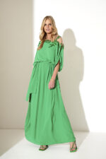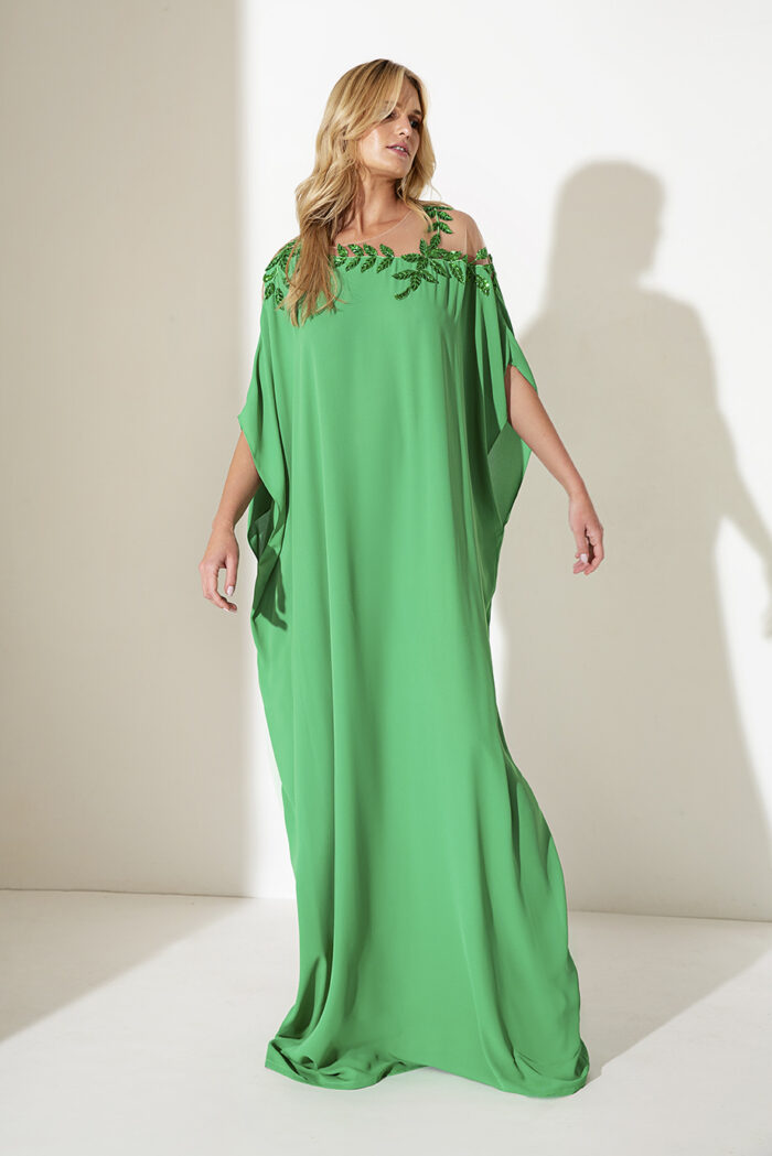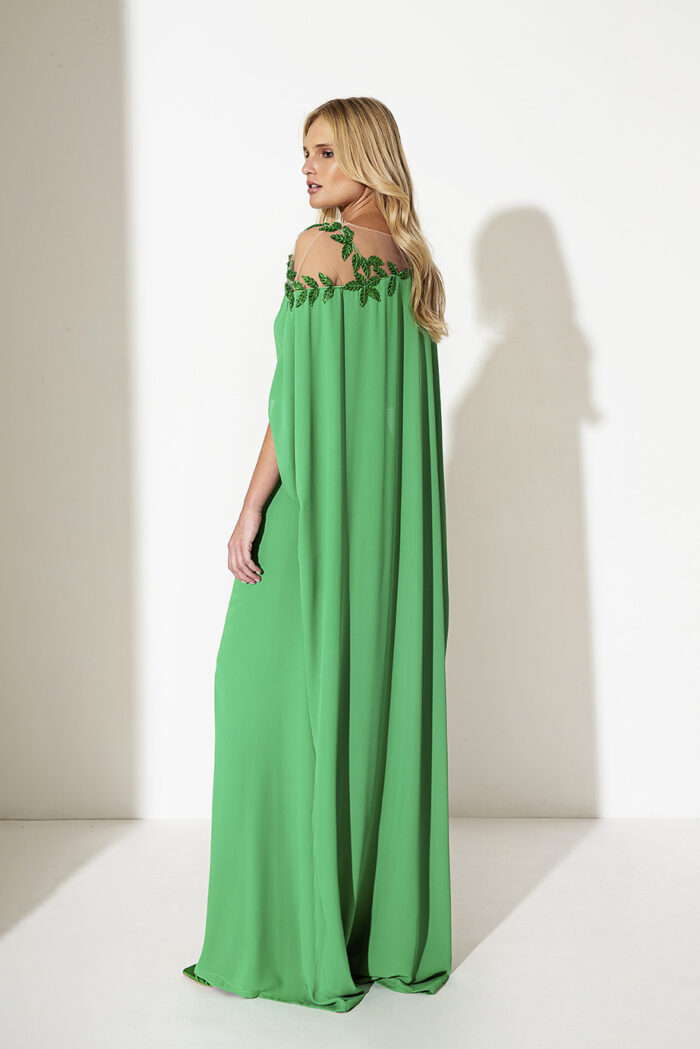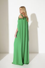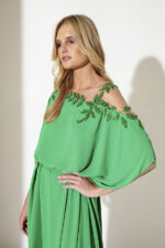 Abito verde Allure Evening lungo cabane morbido con foglie decorative spalle o indossato con cintura in tessuto