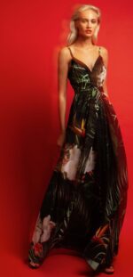 Abito Maestri haute couture nero e verde o nero e fucsia con fiocco decorativo