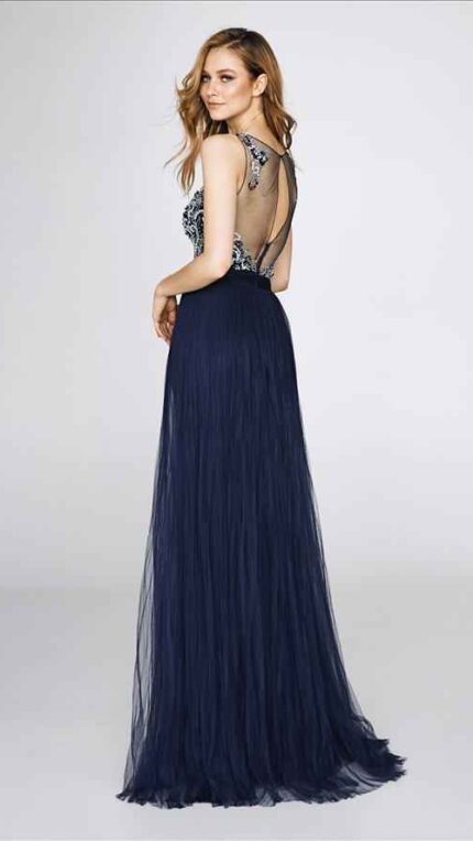 Abito tutone completamente in paillette maestri colore blu scuro con parte top larga e sotto leggermente trasparente