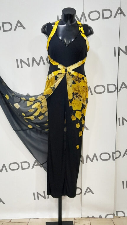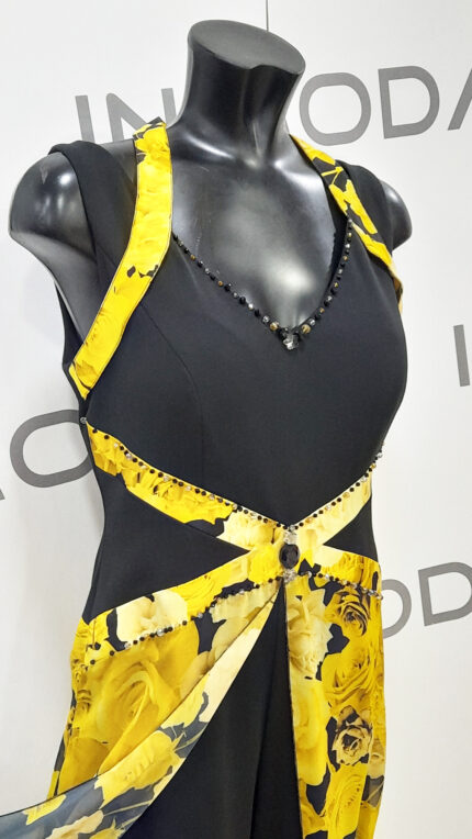 Abito tutone con pannelli sulle gambe colore nero e giallo con cristalli in vita e spalline normali