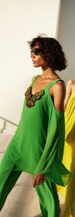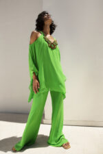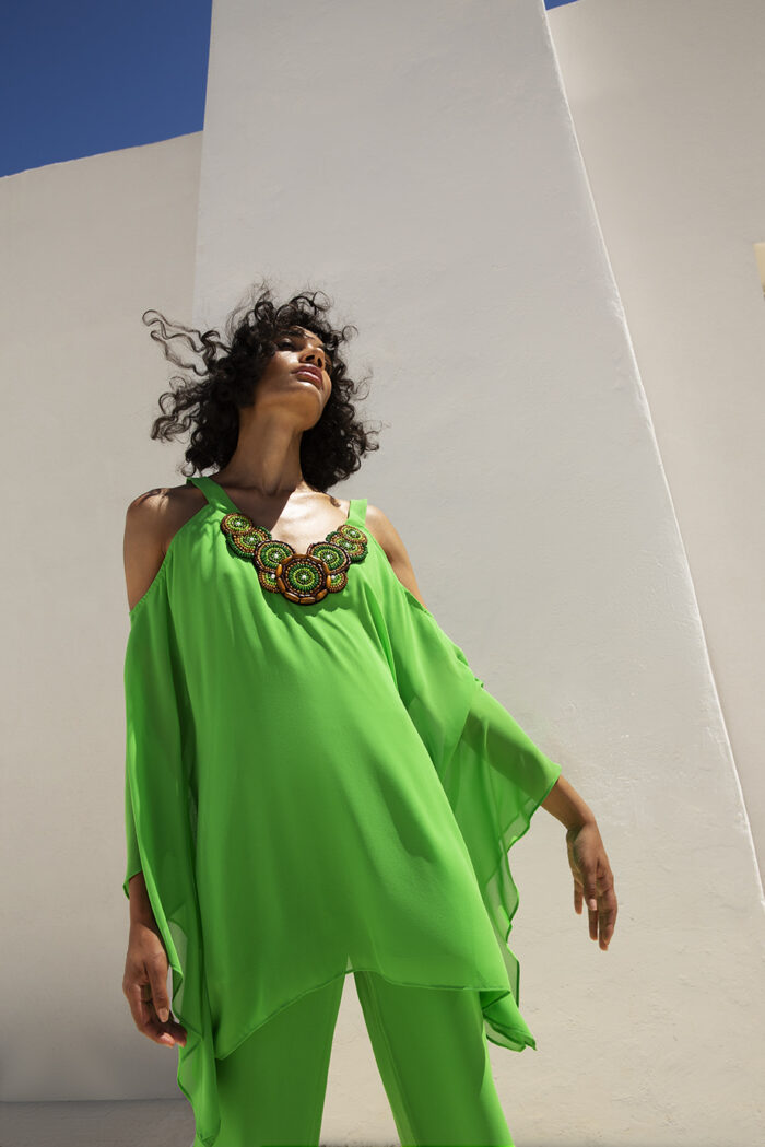 Abito verde completo pantalone twins fantasy collo gioiello manica lunga spalle scoperte