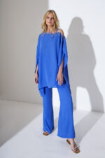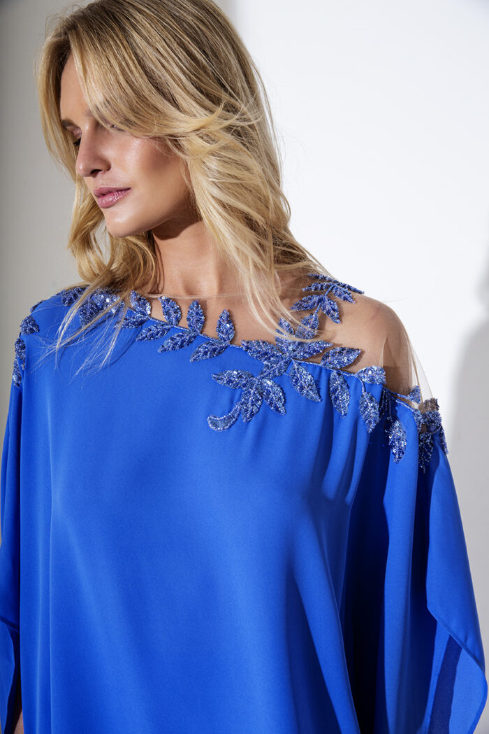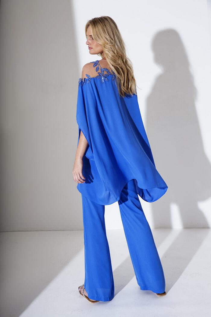 Allure Evening completo pantalone con casacca larga monospalla decorato con foglie brillanti e pantalone largo blu