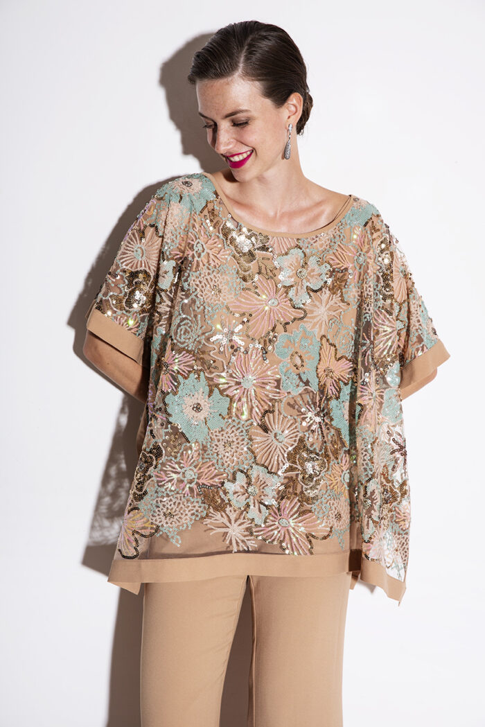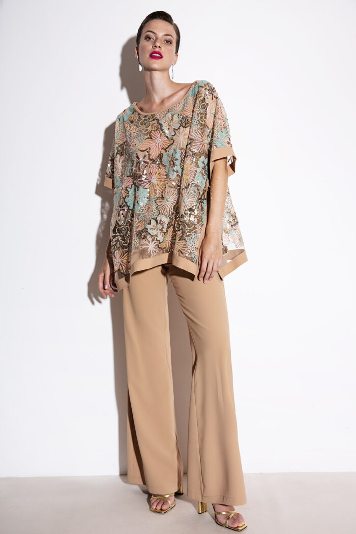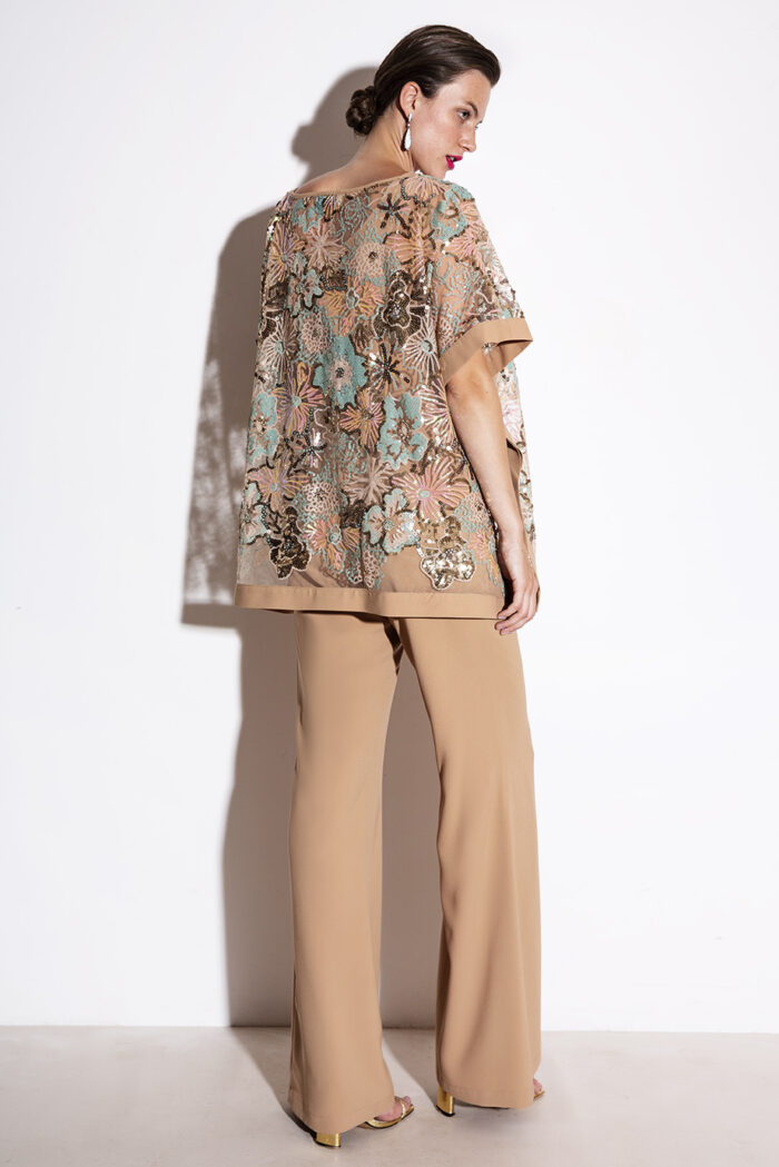 Completo pantalone Allure evening beige arancio pizzo fiori paillette