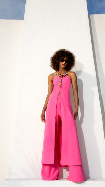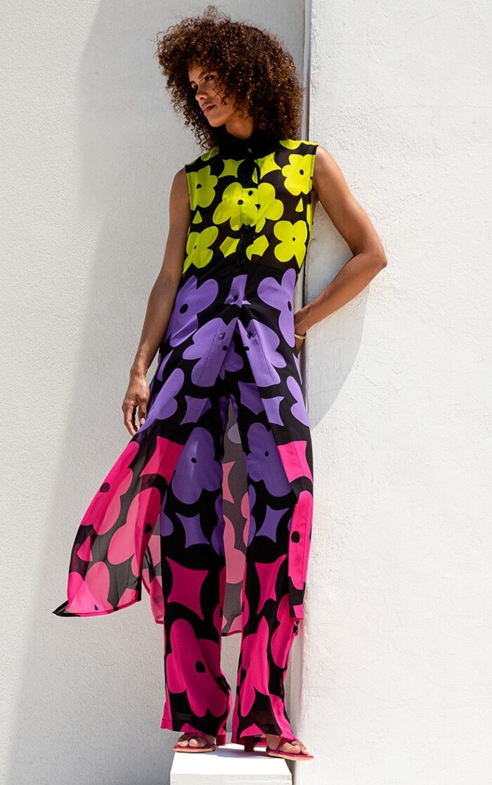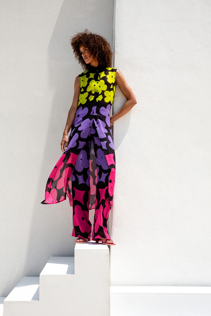 Completo pantalone Twins Fantasy a fantasia nero con fiori gialli rosa e viola tunica lunga e pantalone