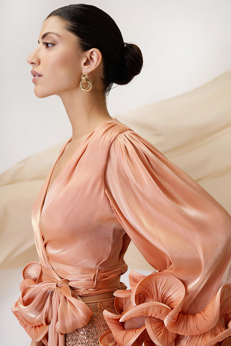 Maestri Haute Couture due pezzi pantalone largo completamente fatto di paillette casacca colore pesca maniche lunghe arricchiate ai polsi allacciatura kimono