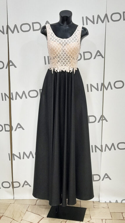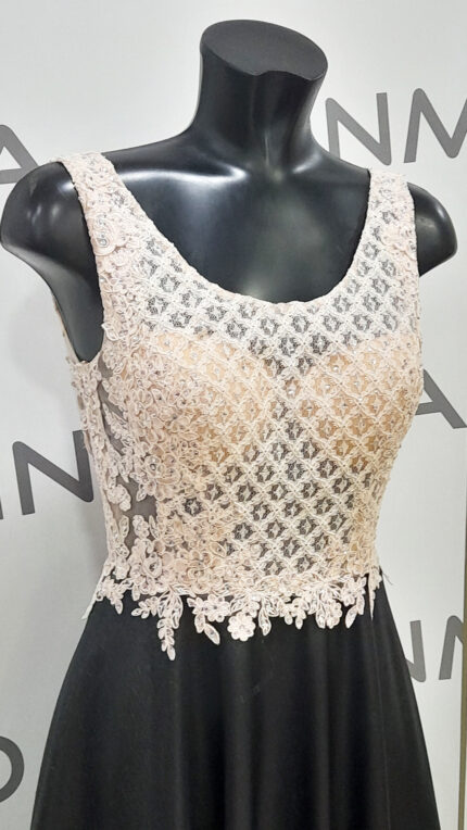 Abito nero e rosa con gonna rigida in mikado e top trasparente in pizzo rosa con cristalli