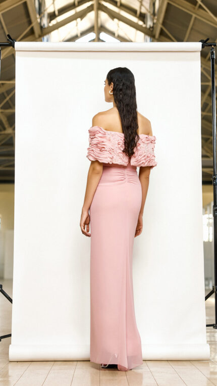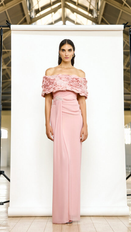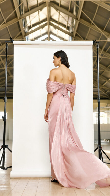 Abito dusty pink effetto omerale Maestri Haute Couture parte superiore arricciata decorata cristalli effetto morbido aderente con nodo decorato