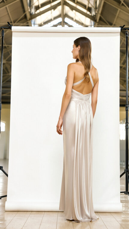Abito lungo Maestri Haute Couture colore platinum con stola di due metri nel tessuto dell’abito parte davanti con nodo e spacco e seno decorato coralli pendenti