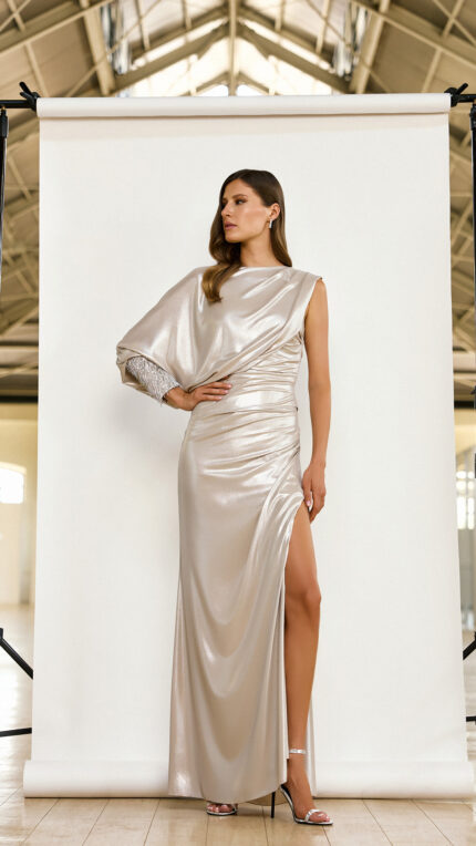 Abito Maestri Haute Couture platinum argento abito morbido con manica lunga mono spalla effetto mantellina con manica decorata corallini pendenti