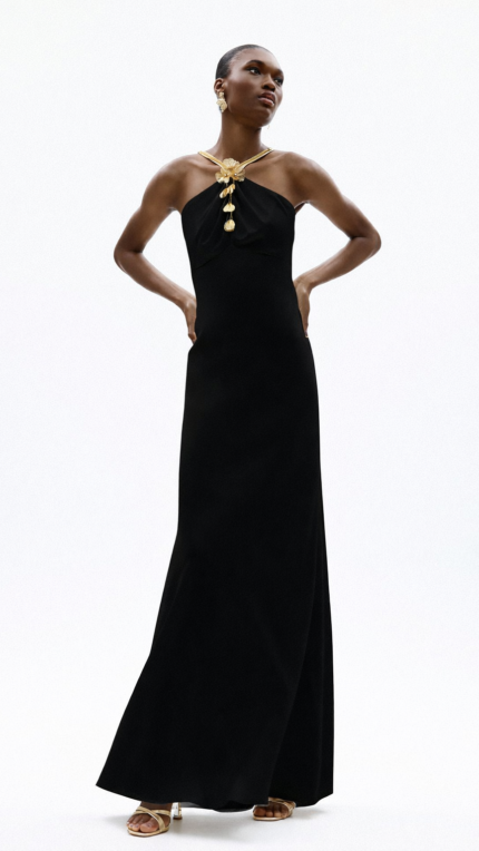 Abito Allure Glow scollo all’americana morbido con fiore oro al collo decorativo nel colore nero
