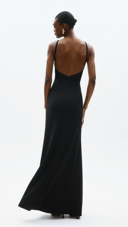 Abito fantasia Twins Fantasy morbido che scende sfiancato con collo con cristalli effetto collana nero che scendono dal centro del petto a spalline schiena scoperta