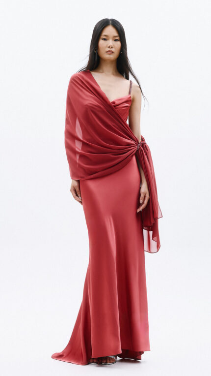 Abito e bolero Allure Glow blush rosso morbido a sirena con scollo morbido e spalline a X decorate con cristalli bolero con chiusura a cristalli morbido