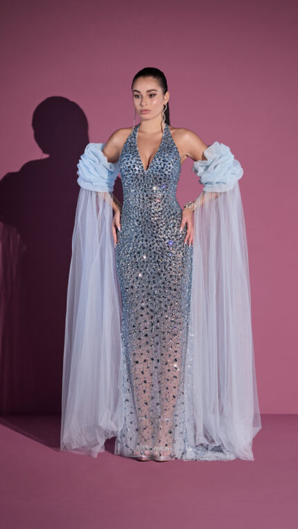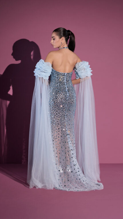 Abito a sirena pieno di cristalli decorativi 18 Celebrity Impero Couture celeste con spalle scoperte e manicotti con pannelli
