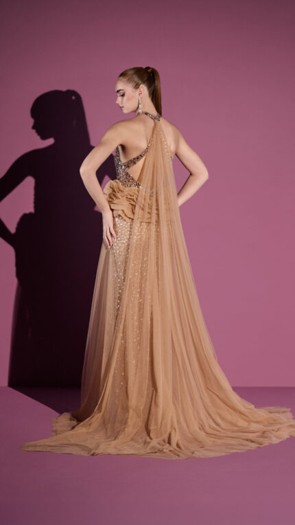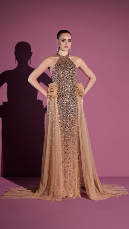 Abito Celebrity 18 Impero Couture trasparente beige interamente decorato con cristalli sovra gonna con arricciatura e pannello da dietro il collo