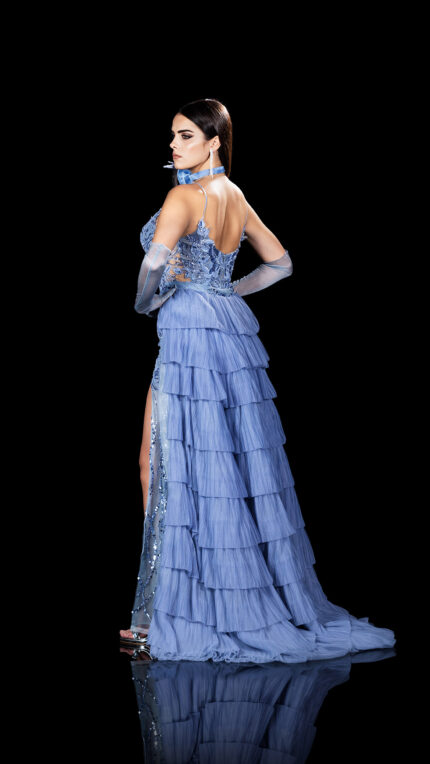 Abito paillettato azzurro con riflessi verdi 18 Celebrity Impero spacco laterale totalmente aperto con pizzo superiore e corpetto steccato