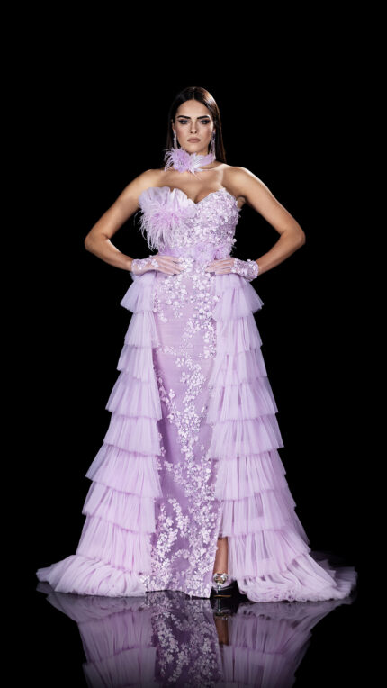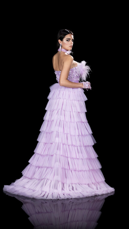 Abito lilla 18 Celebrity Impero taglio a sirena comprensivo di guanti spacco davanti seno e davanti cristalli applicati con spalline intreccio
