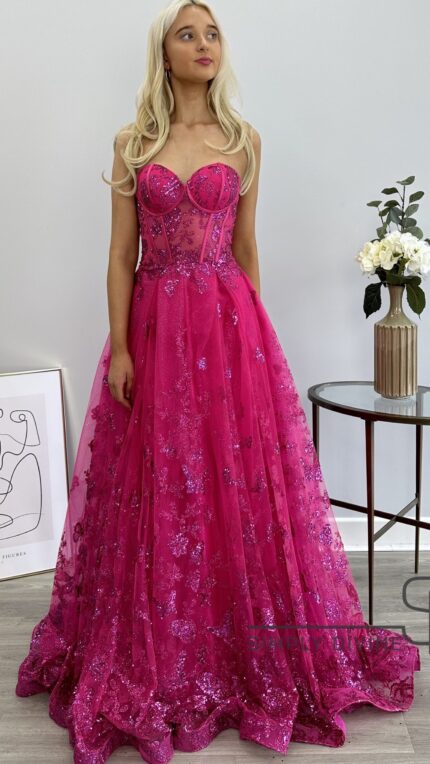 Abito brillantinato corpetto steccato celeste fucsia e lilla Simply Divine diciottesimi