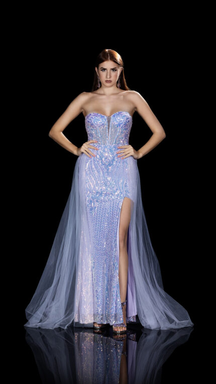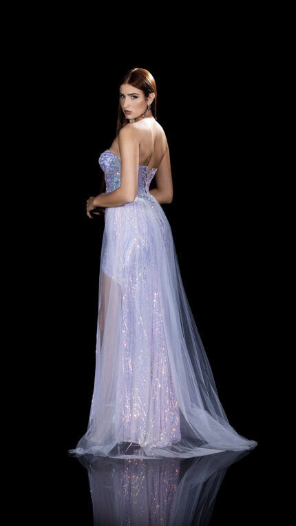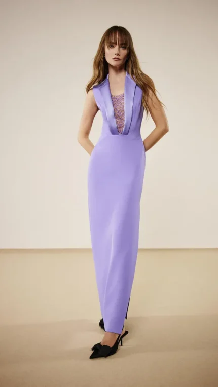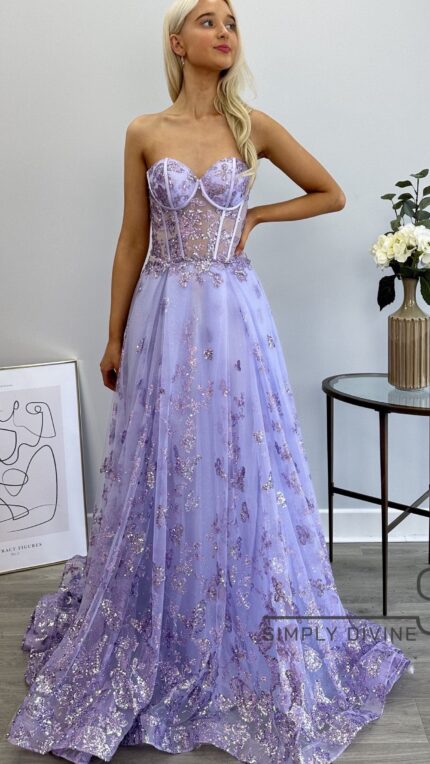 Abito lilla lungo 18 Celebrity Impero Couture con pannello in tulle spalle scoperte con scollo a balconcino aderente sui fianchi e spacco davanti