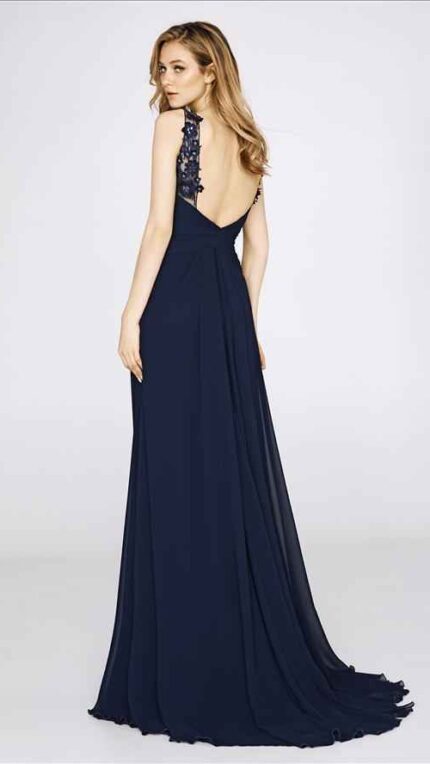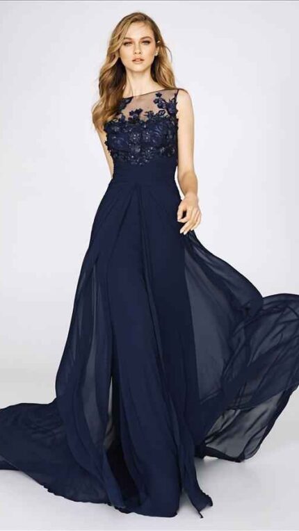 Abito lungo The Party Edit Pronovias in pizzo decorato blu a rami con foglie modello a sirena
