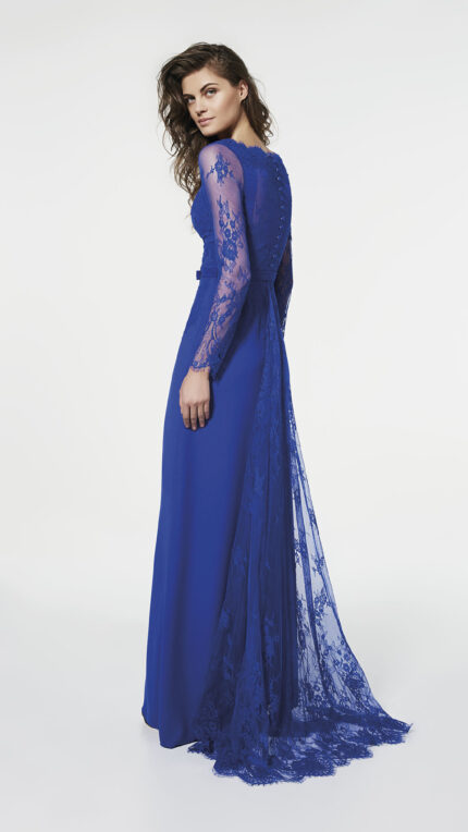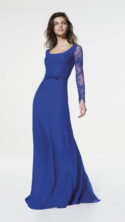 Abito pronovias lungo in rasone e pizzo blu e rosso con manica trasparente in pizzo