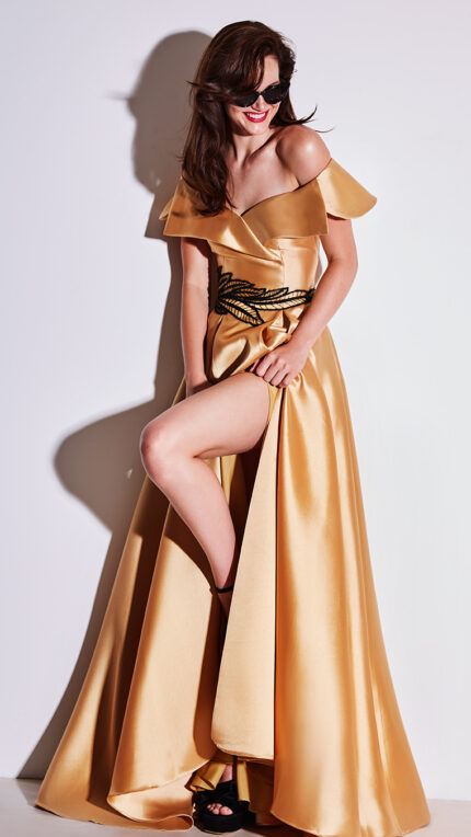 Abito pronovias color oro con fianchi e schiena trasparenti modello a sirena con scollo a cuore