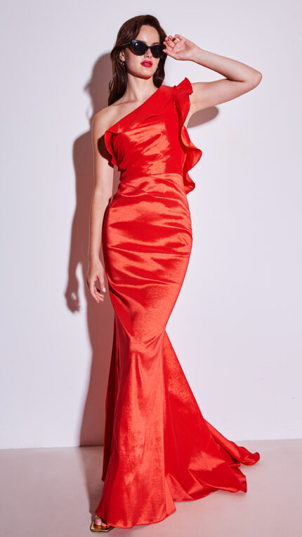 Abito rosso monospalla Pronovias con coda a strascico decorazione gioiello pancia spacco modello aderente