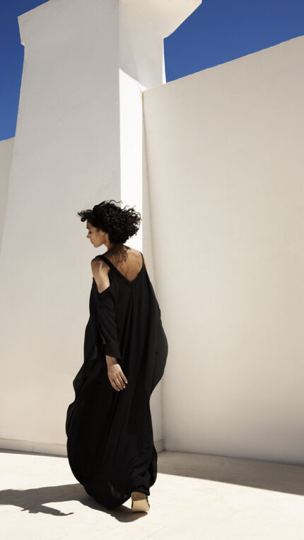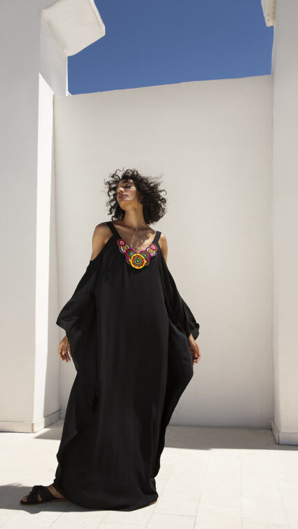 Abito largo twins fantasy nero con collo gioiello spalle scoperte modello tunica