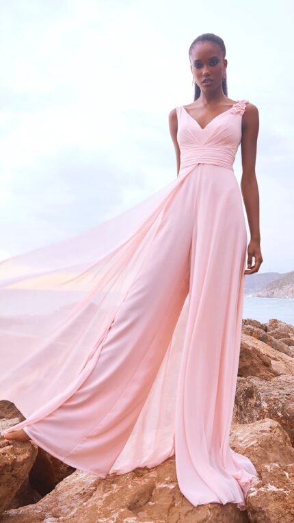 Abito pronovias blu e rosa tutone con pannello che scende a coda spallina decorata a fiori sfiancato