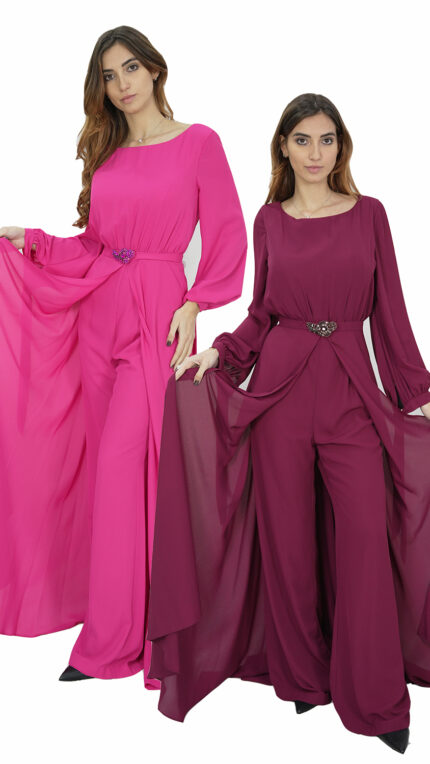 Abito tutone con pannello Nicole Moments chiffon scollo profondo spalle a v pancia scoperta fucsia e blu