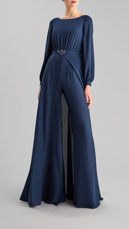 Abito tuta con pannello Pronovias The Party Edit accollato morbido con gioiello su pannello rimovibile blu, fucsia e rosso