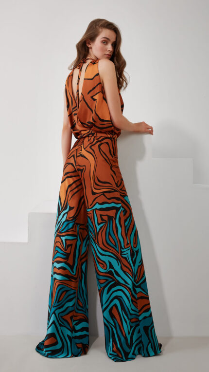 Abito tutone maestri colore terra con stampa blu spalle gioiello morbido sopra con cintura e pantalone largo
