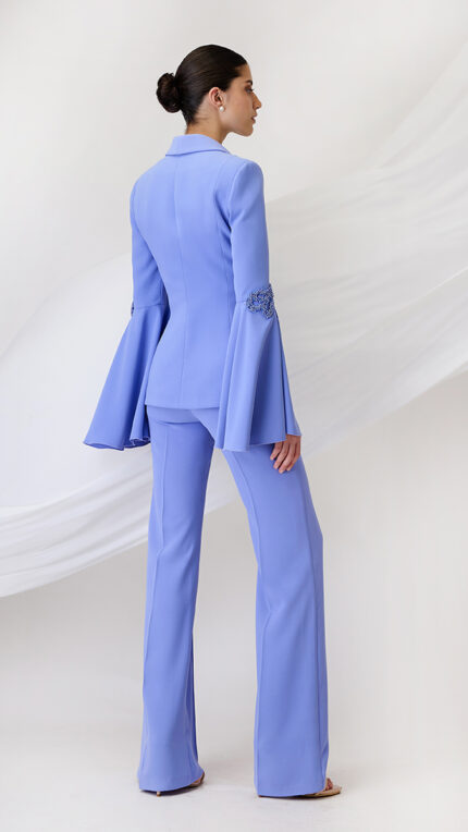 Abito Maestri Haute Couture smoking donna con pantalone largo giacca collo sciallato manica a campana decorazioni corallini