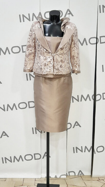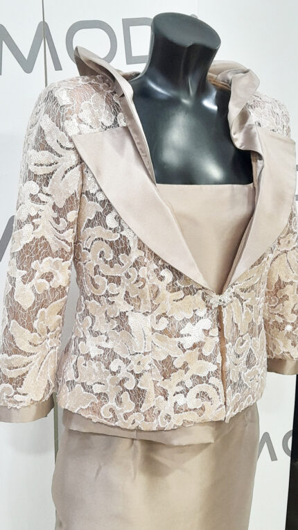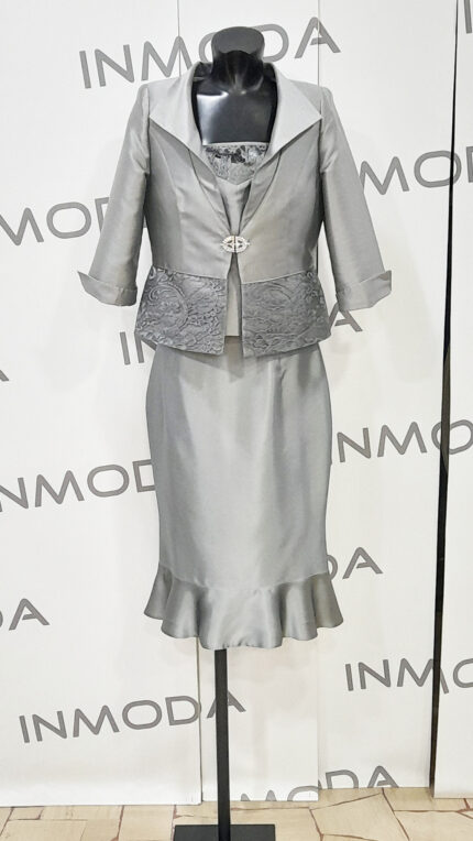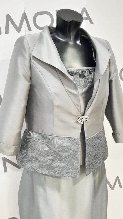 Abito sartoriale mamma sposa argento lucien mosco con riporto in pizzo gonna canotta e giacca