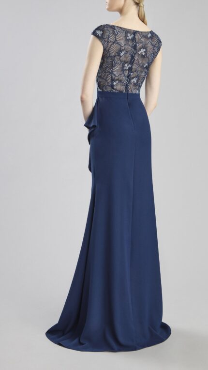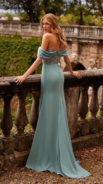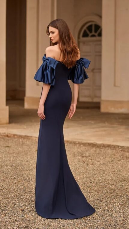 Abito a sirena Nicole Moments con fiocchi sulle maniche spacco modello liscio