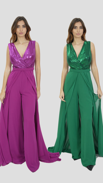 Abito tutone con pannello intergrato Nicole Moments scollo a V che scende con cintura e pantalone verde, blu e fucsia