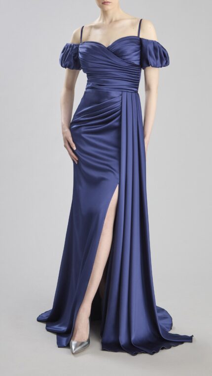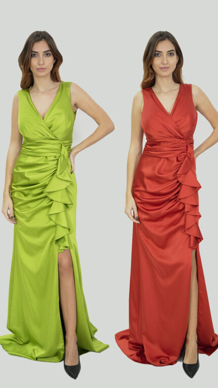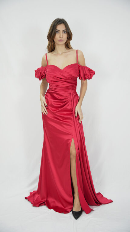 Abito satin Nicole Moments con pannello davanti lungo sino ai piedi spacco due spalline e manica palloncino rosso e blu