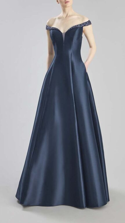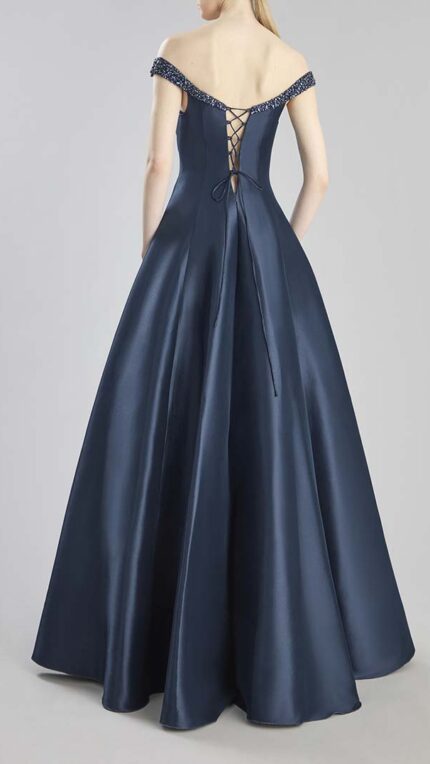 Abito mikado e cristalli Nicole Moments collo omerale gonna larga con allacciatura a stringhe blu e rosso