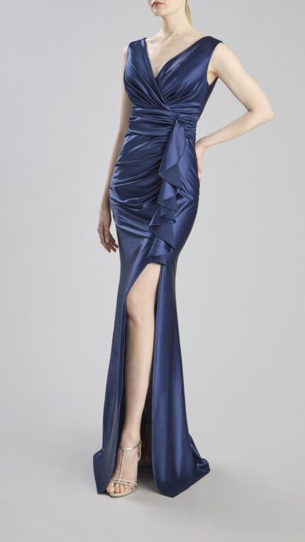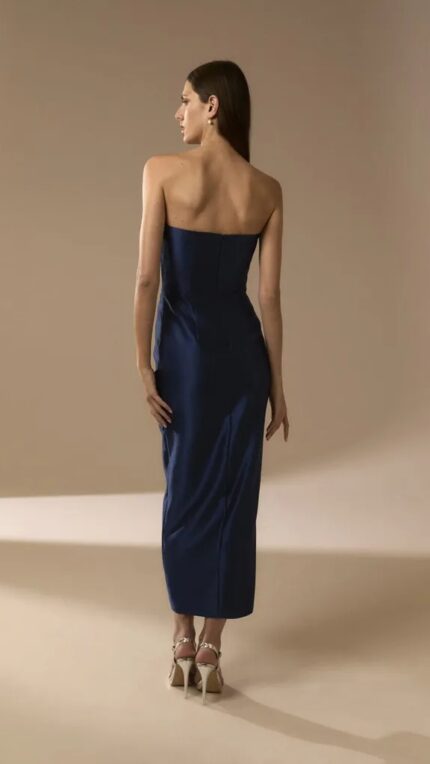 Abito in raso Nicole Moments blu lungo sino a sotto il ginocchio completamente scollato fiocco sul davanti e spacco