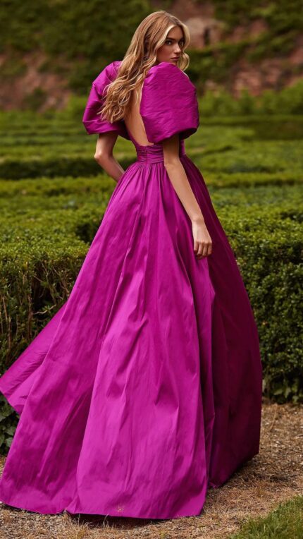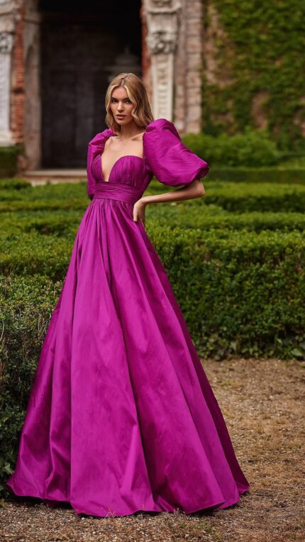 Abito nicole moments fucsia lungo con gonnellone scollo a cuore molto accentuato e spalline a palloncino