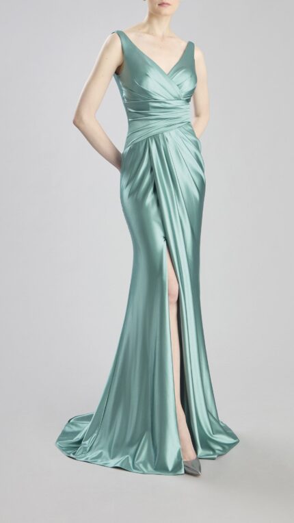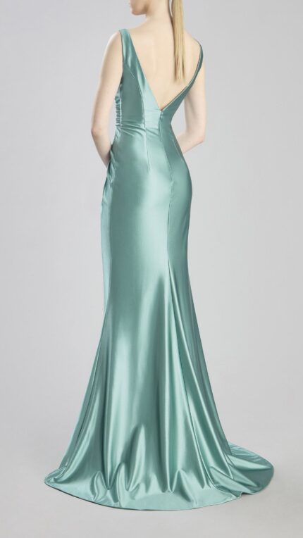 Nicole Moments acquamarina lucido satin morbido spacco vita aderente doppia spallina abito
