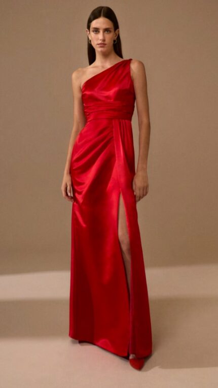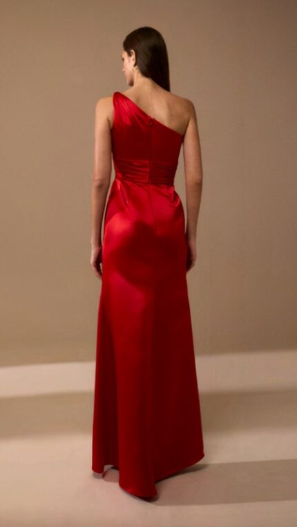 Abito rosso monospalla Nicole Moments sfiancato con spacco sulla gonna davanti modello a sirena aderente sui fianchi