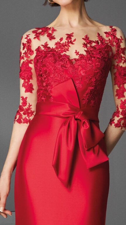 Abito corto pronovias sopra pizzo sotto mikado rigido con fiocco decorativo manica tre quarti pizzo