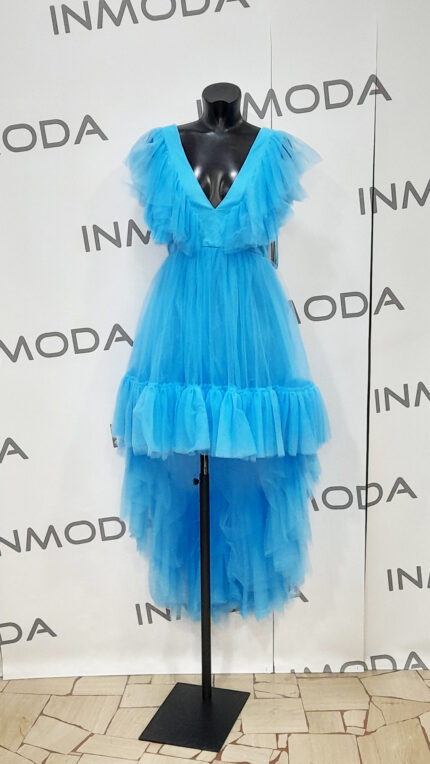 Abito twins fantasy in tulle corto avanti e lungo dietro giallo e azzurro con spalline larghe tulle