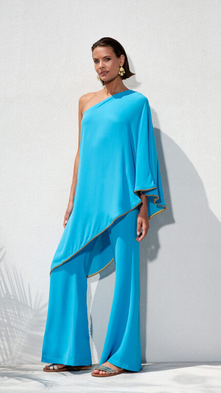 Completo pantalone turchese twins fantasy azzurro pantalone largo e mantella mono spalla decorata con inserti oro